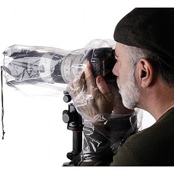 A capa também é montável em tripé, bastando colocar primeiro o conjunto câmera/lente dentro e, em seguida, instalar o conjunto completo sobre o tripé. O design transparente permite o acesso total ao visor e aos controles da sua DSLR. Você pode personalizar a capa para acomodar a ocular da câmera, bastando cortar um pequeno orifício na capa para passar a ocular para a parte exterior.
