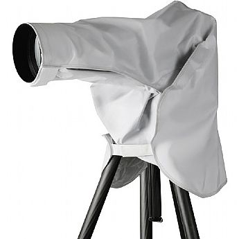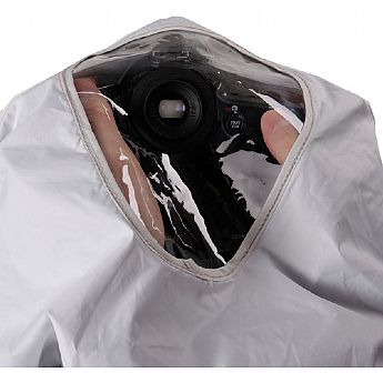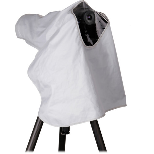 A Capa de Chuva Ruggard de Tecido para Câmera (Cor Branca), resistente à água, protege DSLRs Canon e Nikon com visores quadrados contra chuva, poeira e lama. Ela possui uma janela de controle transparente na parte traseira com uma visão das telas superior e traseira da sua câmera. Há também uma capa de barril de lente ajustável mais adequada para lentes de 7 a 14 polegadas de comprimento (17,8 - 35,6cm) e 4 a 4,5 polegadas de diâmetro (10,2 - 11,4cm). Há também uma porta de ocular na janela de controle que permite prender a capa de chuva no visor da sua câmera para visibilidade contínua. Três oculares também são fornecidas com a capa de chuva, permitindo que você personalize a porta de ocular da sua câmera. Quando não está em uso, a capa de chuva pode ser armazenada e transportada no case com cordão incluso.