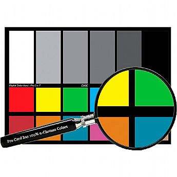 - O cartão cria uma referência objetiva para ser usada no estúdio ou no seu trabalho de pós-produção para comparar e analisar quaisquer diferenças de cor ou erros - para que você possa obter sempre cores digitais de ponta, desde a captura até a exibição e a impressão!