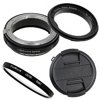 O Kit é composto de um anel Reverso de Macro, um filtro UV, uma tampa de lente e o Controle de Abertura de Diafragma Fotodiox.