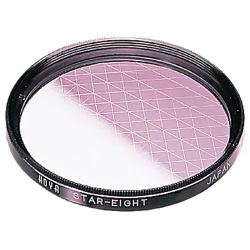 O Filtro Hoya Efeito Estrela (de 8 pontas) de 58mm possui uma superfície que é marcada com um padrão de grade fina. Dependendo do padrão, os reflexos e as fontes de luz de ponto único podem criar estrelas com raios múltiplos.