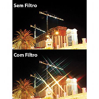 O Filtro Hoya Efeito Estrela (de 4 pontas) de 52mm possui uma superfície que é marcada com um padrão de grade fina. Dependendo do padrão, os reflexos e as fontes de luz de ponto único podem criar estrelas com raios múltiplos.
