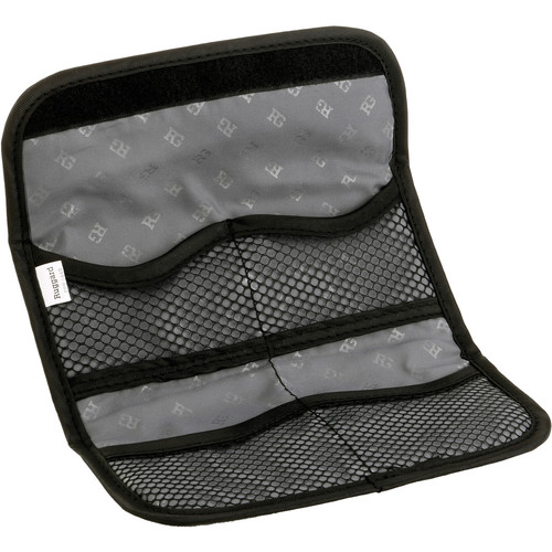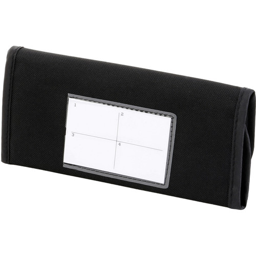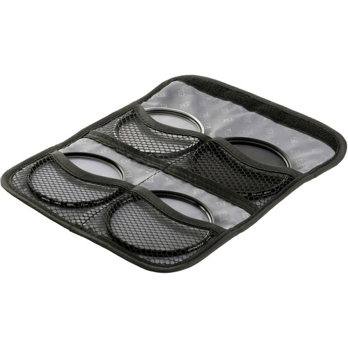 A bolsa é acolchoada se dobra e, três partes e apresenta um fecho rápido preso à borda. Um cartão branco é afixado na parte traseira do estojo para poder anotar e identificar cada filtro.