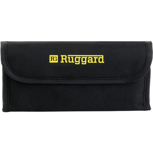 O estojo Ruggard guarda até 4 filtros em bolsos acolchoados, e os prende com uma malha de forma bem segura. A bolsa tem quatro bolsos, dois superiores para filtros de até 77mm e dois bolsos inferiores para filtros de tamanho até 82mm.