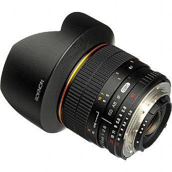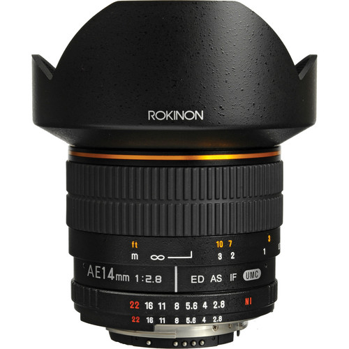 A Lente Rokinon de 14mm Ultra Grande Angular f/2.8 IF ED UMC para Nikon com chip de confirmação de foco fornece uma visão de aproximadamente 115° com resultados dramáticos quando usada com uma câmera digital de quadro inteiro ou câmera de filme 35mm. Ele inclui um chip especial que permite que a lente opere com as funções de confirmação de foco de câmera, exposição automática, medição automática e balanço de branco automático. Com lentes aesféricas híbridas, você produzirá imagens claramente nítidas com o mínimo de distorção e aberrações cromáticas. Essa lente de 14mm de foco manual foca até 0,9' (28cm) de distância da lente e possui um para-sol de lente tipo pétala integrado. Com algumas câmeras, a Trava de Obturador deve ser desativada no menu da câmera.