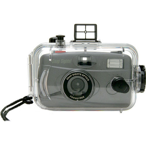 A Câmera Subaquática com Flash Snap Sights SS01 com filme de 27 Poses até 33 Metros de Profundidade é uma simples câmera 35mm em um case transparente que permite tirar fotos durante mergulhos com snorkel ou na piscina. Esta câmera é muito resistente e fácil de usar. Para imagens em terra, a caixa para ar livre da câmera fornece proteção contra chuva, umidade, poeira e outros ambientes extremos.