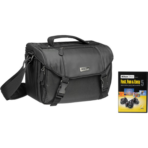 A Bolsa Nikon para Câmera Fotográfica DSRL com DVDs de Treinamento Nikon School contém um kit com 2 DVDs de treinamento da Nikon (em inglês) e uma bolsa de acessórios para D-SLR. O kit com 2 DVDs "Fast, Fun & Easy 5" é apresentado pelo fotógrafo Bob Krist premiado pela National Geographic Traveler e pelo premiado fotógrafo de retratos e casamentos Kevin Kubota. Ele contém informações para as câmeras D-SLR Nikon D3000, D3100 D5000, D5100 e D7000.