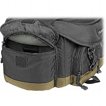 A Bolsa Profissional de Fotografia e Acessórios Canon 1EG é uma bolsa repelente à água que comporta uma câmera SLR e várias lentes com espaço para acessórios. Ela possui partições internas e acolchoamento, reforço em couro, fivelas de liberação rápida de alta resistência, bolsos externos acolchoados, alça em couro e tira de ombro.