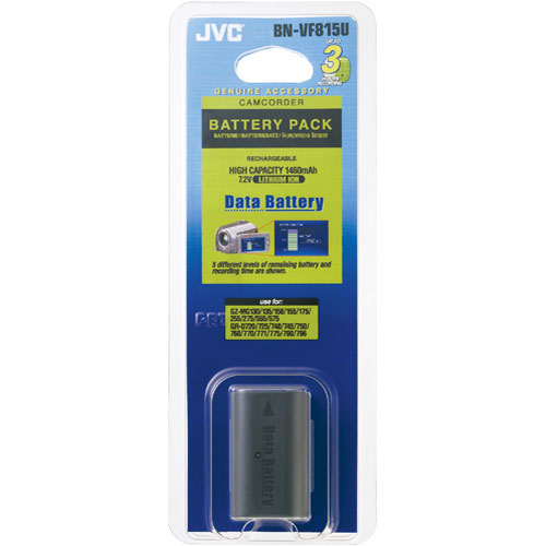 A Bateria Original JVC BN-VF815 de Íons de Lítio (1460mAh) é a bateria de reposição do equipamento original para muitas camcorders JVC. Seu design de íons de lítio o torna imune ao efeito "memória", que ocorre com diversas baterias recarregáveis. Você pode carregar esta bateria sempre que desejar, sem comprometer sua performance. Cada carga pode alimentar sua camcorder por até 3 horas.