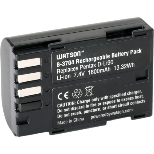 A Bateria Watson D-Li90 de Íons de Lítio para Câmeras Pentax (7.4V, 1800mAh) funciona com as mesmas câmeras que a Sony D-Li90. Este pack de bateria de reposição possui uma capacidade de 1800mAh, 7,4V de potência de saída e 13,32 watt/horas. Compactas e leves, as baterias de íons de lítio podem ser carregadas ou descarregadas a qualquer hora sem desenvolver o "efeito memória".