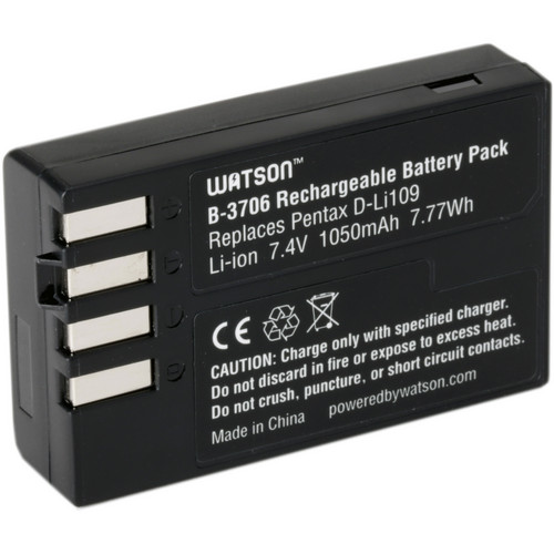 A Bateria Watson D-LI109 de Íons de Lítio para Câmeras Pentax (7.4V, 1050mAh) é compatível com as mesmas câmeras que a Pentax D-LI109. Esta bateria de reposição possui capacidade de 1050mAh, 7,4V de saída e 7,7 W/h. Pequenas e leves, as baterias de íons de lítio podem ser carregadas e descarregadas a qualquer momento sem desenvolver o efeito memória.