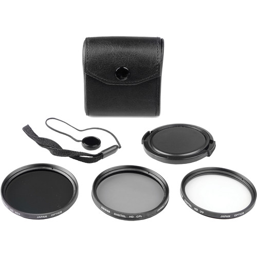 O Kit de Filtros Digitais Bower 58mm inclui um filtro de desnidade neutra ND4, um filtro polarizador circular, e um filtro de UV, bem como uma tampa da lente, e um cordão para suporte da tampa. Uma pochete de proteção é fornecida para manter seus filtros seguros quando não estiver em uso.