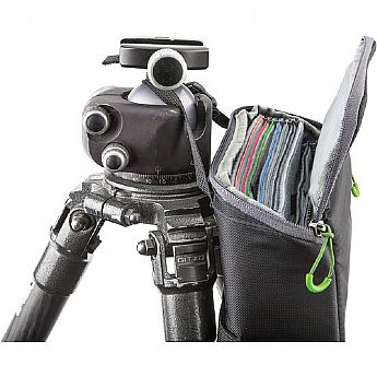 O case inteiro pode ser montado em cinto ou conectado no seu tripé por meio da sua conexão de liberação rápida. Bolsos frontal e interno com zíper são fornecidos e acessados usando puxadores. Todos os zíperes possuem design YKK. A parte traseira do case possui um painel montável em correia e alça de mão de liberação rápida para prender em um tripé.