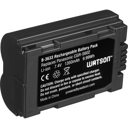 A Bateria Watson CGR-S602 de Íons de Lítio para Câmeras Panasonic (7.4V, 1350mAh) funciona com as câmeras Panasonic CGR-S602, à Leica BP-DC1 e à Leica BP-DC3. Este pack de bateria de reposição possui uma capacidade de 1350mAh, saída de alimentação de 7,4V e 9,99 watts por hora. Pequenas e leves, baterias de íons de Lítio podem ser carregadas e descarregadas a qualquer momento sem desenvolver efeito memória.