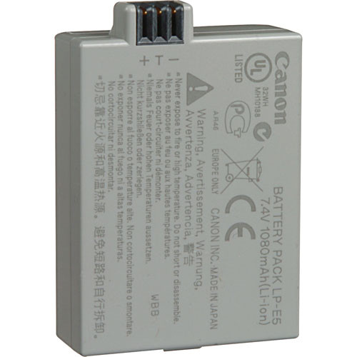A Bateria Recarregável de Íons de Lítio Canon LP-E5 possui capacidade de 1080 mAh, assim é possível tirar até 1.000 fotos em temperaturas normais com uma única carga de bateria. A bateria também é mais compacta e mais leve do que os modelos mais antigos.