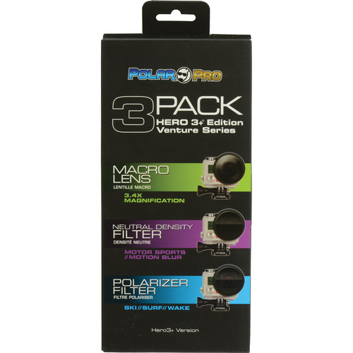 O Kit de 3 Filtros Polar Pro Venture3+ para Caixas Estanque GoPro HERO3+ é um conjunto que consiste de um filtro polarizador, um filtro de macro ou close-up e um filtro ND. Todos os três filtros possuem componentes óticos totalmente em vidro e são projetados especificamente para encaixar na porta de lente de caixas subaquáticas HERO3+ e Caixa Skeleton.