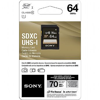 O Cartão de Memória Sony SDXC de 64GB UHS-I Classe 10 oferece uma velocidade de leitura máxima de 70MB/s. Ele foi projetado para o uso com dispositivos compatíveis com cartões de memória SD. Esse cartão Classe 10 USH-1 é à prova d'água e construído para suportar temperaturas extremas. O software File Rescue disponível para download ajuda a recuperar fotos e vídeos que foram acidentalmente danificados ou apagados.
