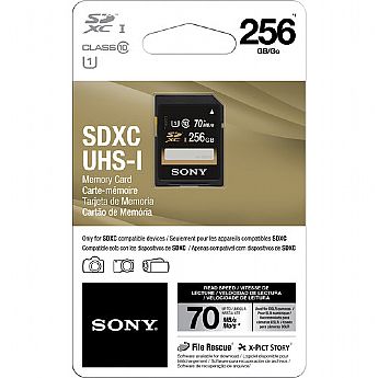 O Cartão de Memória Sony SDXC de 256GB UHS-I Classe 10 oferece uma velocidade de leitura máxima de 70MB/s. Ele foi projetado para o uso com dispositivos compatíveis com cartões de memória SD. Esse cartão Classe 10 USH-1 é à prova d'água e construído para suportar temperaturas extremas. O software File Rescue disponível para download ajuda a recuperar fotos e vídeos que foram acidentalmente danificados ou apagados.