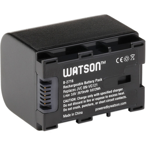 A Bateria Watson BN-VG121 funciona com as mesmas câmeras que a JVC BN-VG121. Este pack de bateria de reposição possui uma capacidade de 2670mAh, 3,6V de potência de saída e 9,612 watt/horas. Compactas e leves, as baterias de Íons de Lítio podem ser carregadas ou descarregadas a qualquer hora sem desenvolver o "efeito memória".