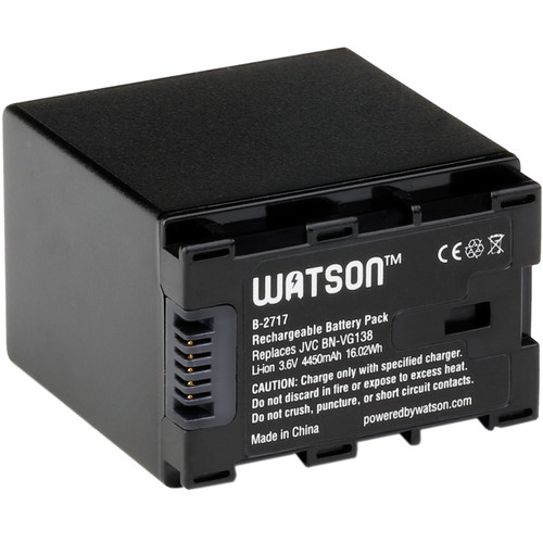 A Bateria Watson BN-VF823 funciona com as mesmas câmeras que a JVC BN-VG138. Este pack de bateria de reposição possui uma capacidade de 4450mAh, 3,6V de potência de saída e 16,02 watt/horas. Compactas e leves, as baterias de Íons de Lítio podem ser carregadas ou descarregadas a qualquer hora sem desenvolver o "efeito memória".
