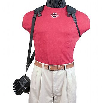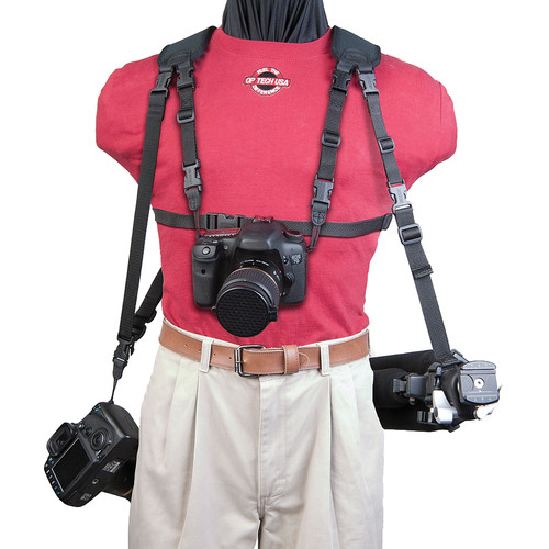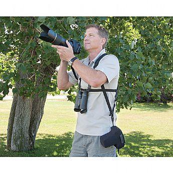 A Alça de Carga/Transporte Tripla OP/TECH USA para até 3 Câmeras é um sistema de fixação que oferece a habilidade de transportar até três câmeras ou binóculos junto ao seu corpo para obter um acesso mais rápido do que seria possível com uma bolsa ou mochila. Ideal para fotógrafos que precisem alternar constantemente entre várias câmeras com lentes diferentes, ou qualquer um que deseje alternar facilmente de um binóculo para uma câmera, o Transportador Triplo é centralmente baseado em uma junção de neoprene reforçada com 61cm de comprimento que se encaixa ao redor da base do pescoço do usuário e é apoiada sobre os ombros. O material em neoprene absorve impactos e se adapta aos contornos do fotógrafo ou esportista e entusiastas de atividades ao ar livre, ajudando a garantir mobilidade e a distribuição apropriada de peso mesmo quando a quantidade máxima de equipamento que o Transportador Triplo pode acomodar estiver encaixada.