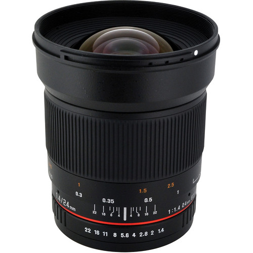 A Lente Grande Angular Rokinon 24mm f/1.4 ED AS UMC para Canon Full Frame fornece uma visão grande angular em 84° quando usada com uma câmera 35mm de quadro inteiro, ou 57,6° quando usada com uma câmera APS-C - excelente para paisagens, áreas internas reduzidas, fotografia de rua e todos os tipos de fotografia em geral. 4 elementos de vidro (ED) de baixa dispersão e dois elementos aesféricos produzem imagens nítidas e bem definidas com o mínimo de fantasmas e reflexos. A lente foca até 9,84 polegadas (25cm) de distância da lente, fornecendo visões close-up notáveis. Um revestimento UMC antirreflexo e multicamada fornece uma excelente transmissão de luz. Todas as funções de exposição e foco são manuais - não há foco automático nem exposição automática.