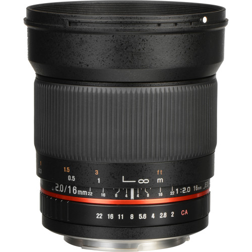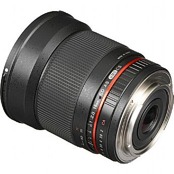 A Lente Rokinon 16mm f/2.0 ED AS UMC CS para Montagem Canon EF-S é uma lente grande angular de foco manual, compatível com câmeras digitais DSLR formato APS-C. Fornece um ângulo de visão de 79,5° equivalente em 35mm a 25.6mm. Uma abertura máxima rápida de f/2.0 é eficiente sob luminosidade fraca e fornece uma profundidade de campo rasa. Com dois elementos de lente aesféricos e um elemento de dispersão extrabaixa, as aberrações cromáticas são minimizadas, e o resultado são imagens nítidas e com precisão de cor. O revestimento de lente UMC facilita a transmissão uniforme de luz e reduz fantasmas e reflexos.