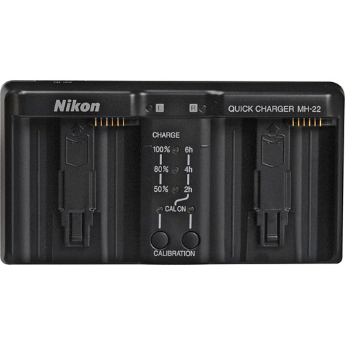 O Carregador Rápido Nikon MH-22 é um Carregador de Bateria de Duas Baias para baterias recarregáveis de íons de lítio Nikon EN-EL4 e EN-EL4a. O carregador pode ser usado internacionalmente* porque ele aceita alimentação 100-240V AC (automático).
