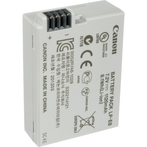 O Pack de Bateria de Íons de Lítio Recarregável Canon LP-E8 possui uma capacidade de 1120mAh, tornando possível disparar várias fotografias com sua câmera digital Canon EOS Rebel T2i / T3i / T4i / T5i com apenas uma carga de bateria. A bateria é compacta e leve. Não possui efeito memória, para que assim você possa recarregar baterias parcialmente esgotadas sem reduzir sua performance.